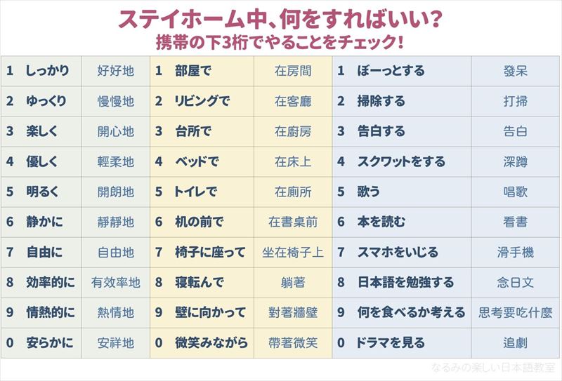 そんな中、ある台湾出身、日本在住の日本語教師・なるみさんが、「ステイホーム中、何をすればいい?携帯の下3桁でやることをチェック」を題とした日本語・台湾華語併記の表を作り、楽しく日本語を学べる教材として自身のFacebookページにアップしました。