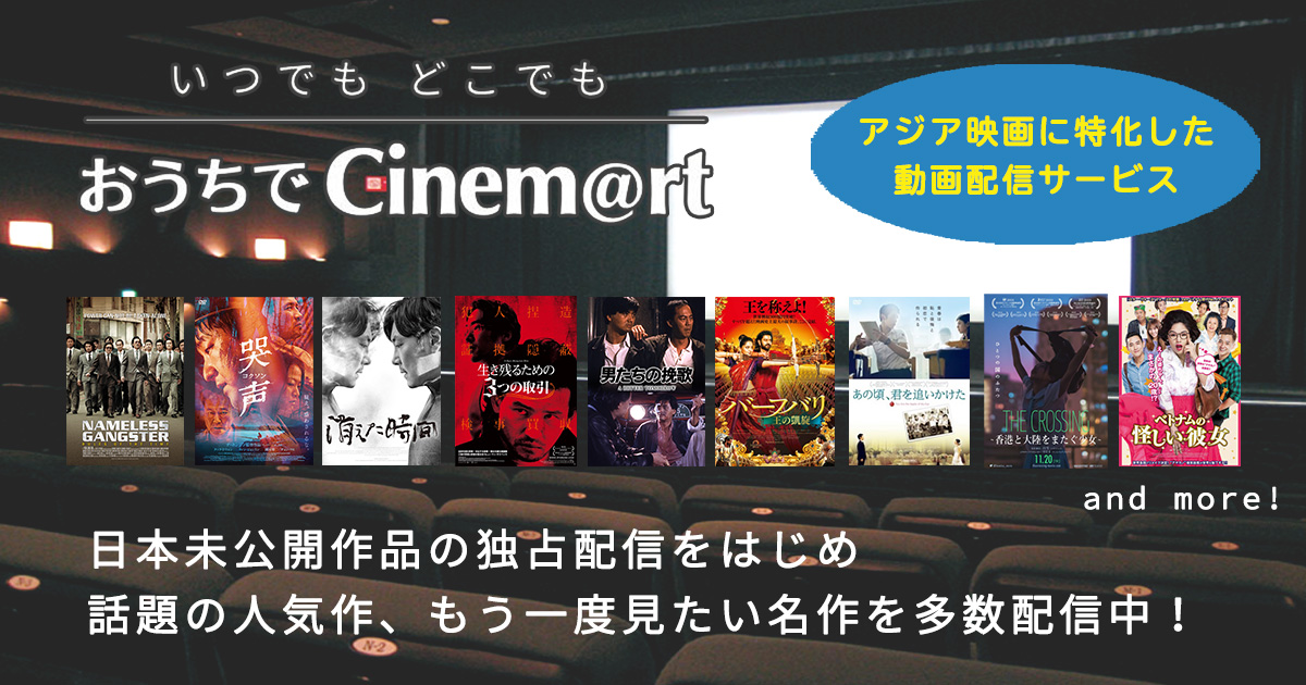 Cinem@rtは、2か月連続映画特集! 第1弾の6月は、「おうちでCinem@rt プレゼンツ! アジア映画が楽しい!」と題し、アジア映画と出会う4つのコラムをお届けします。特集スタートに先駆けて、アジア映画に特化した動画配信サービス「おうちでCinem@rt -いつでも・どこでも- 」で使用できる、無料鑑賞クーポンを40名様にプレゼントいたします!