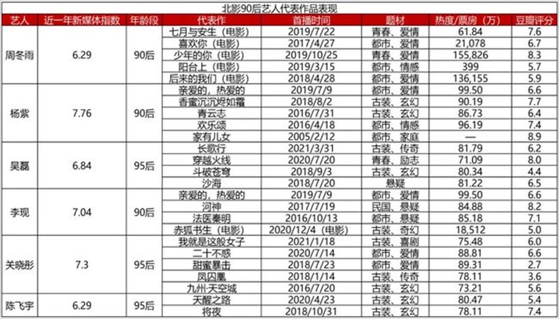 上の図は、北京電影学院出身の芸能人とその出演作をまとめたもので、90后で特出しているのはヤン・ズー(楊紫)とチョウ・ドンユィ(周冬雨)。