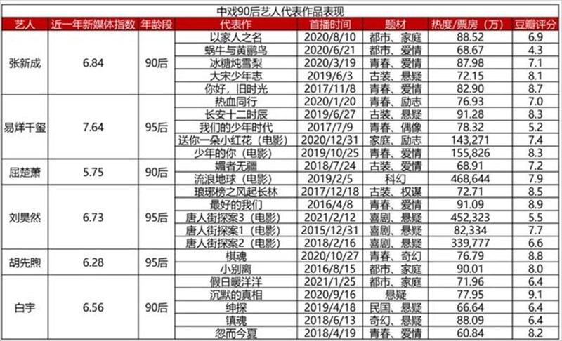 95后で特出しているのは、グァン・シャオトン(关晓彤)とウー・レイ(呉磊)。しかしながら、人気の高い2人はともに演技に浮き沈みがあり、作品のクオリティが十分に安定せず、引き続き演技の向上が必要とも。