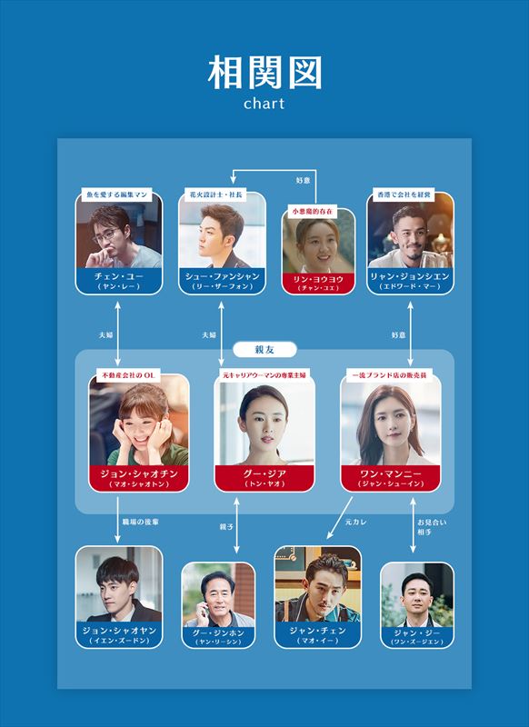 最新時代劇「清平楽(原題)」で北宋時代の皇帝の妻を演じ高く評価されているジャン・シューイン、大ヒット宮廷ドラマ「如懿伝 〜紫禁城に散る宿命の王妃〜」などに出演するトン・ヤオ、ドラマ「王女未央-BIOU-」、「シンデレラはオンライン中!」など人気作品に出演するマオ・シャオトンと、美貌も兼ね備えた実力女優が集結! 人気女優たちによって30歳を迎える女性たちの生活や恋愛がリアルに演じられ、不倫、破産、失恋、離婚などさまざまな要素が取り入れられている。女性ならではの苦悩と選択、そして三者三様の人生の変化に、多くの視聴者が共感すること間違いなし!