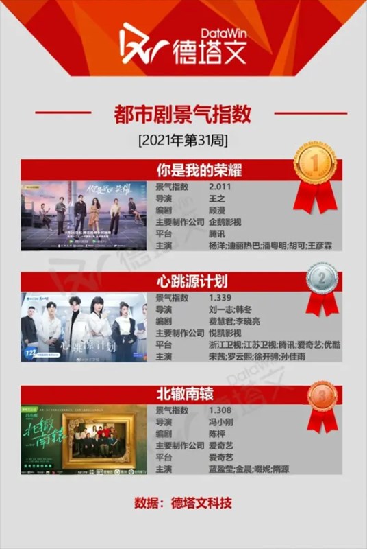 「你是我的栄耀」は見事なスタートをきり、現代ドラマカテゴリーの激しい競争の中でNO.1を獲得した。人気作家グー・マンの原作も非常に有名で、ディリラバ&ヤン・ヤンという主演二人のラインナップも注目の的に、宇宙開発&ゲーム&芸能界などの要素も新鮮で人気だ。原作ファン、主演二人のファン、アイドルドラマファン、と多層的な視聴者を確保し、過去6ヶ月で最も繁栄指数が高い現代アイドルドラマにもなっている。