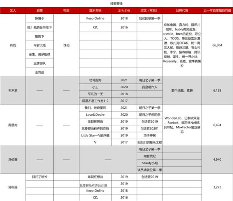 まずは、哇唧唧哇娯楽文化(以下、哇唧唧哇)から。上の表は、哇唧唧哇を代表するアーティストたちの活動をまとめたもの。