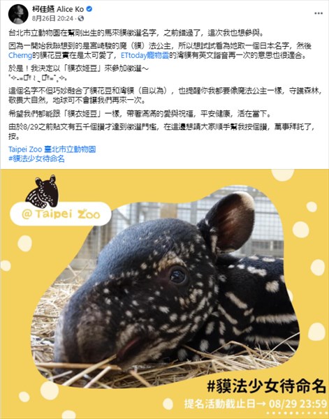 【台湾レポート】台北市立動物園の新生マレーバクのネーミングイベント、台湾の人気女優からの提案も