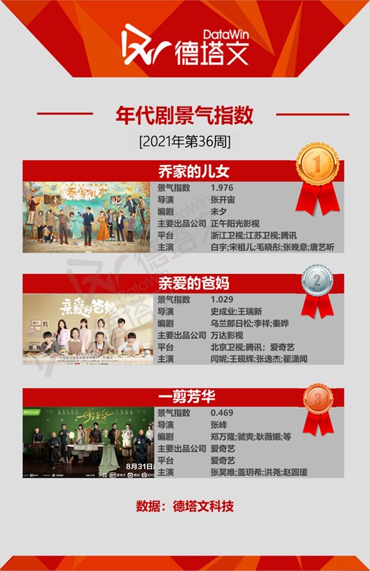 最近の年代劇で描かれるのは主に家族ドラマ。1位を獲得したのはバイ・ユー(白宇)、マオ・シャオトン(毛曉彤)、ラレイナ・ソン(宋祖儿)らが出演する「喬傢的儿女」。伝統的な親の視点に焦点を当てた「親愛的爸媽」は今週で終了に。