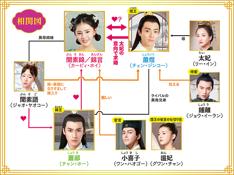 ある晩、宮殿では若き国王・煜王(いくおう)のお妃選びの宴が開かれる。将軍家の娘・聞素錦(ぶんそきん)は、宴をさぼって祭りに出かけ、そこで出 会った貴公子に一目惚れ。