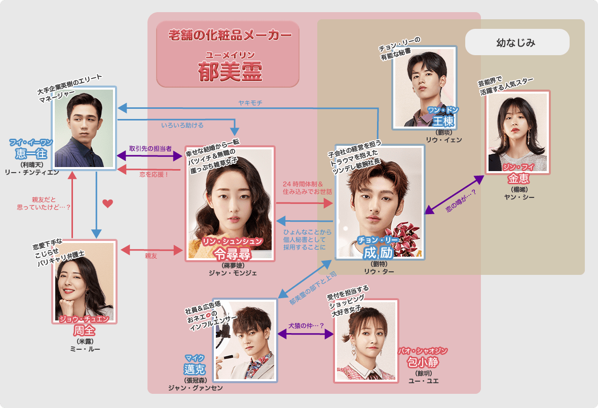 23歳。老舗化粧品メーカー郁美霊の子会社の経営を担うツンデレ敏腕社長。ひょんなことから令尋尋(リン・シュンシュン)を個人秘書として雇うことに。トラウマを抱えている。