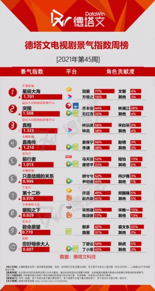 「星辰大海」はスタートから景気指数も好調。この作品のポイントは二つ。ヒロインが90年代の中国の貿易会社で草の根的存在となり成長していく姿を描いた点と、多国籍企業との闘争や独自の外国貿易会社の設立など巨大なドラマのスタイルと職場ものを巧みに統合させ、中国の90年代の特徴を際立たせ、時代の流れの中での闘争と強い愛情を新たな視点で描く作品となった。これによりコンテンツは独特なものとなり、さまざまな若い視聴者に受け入れられるようになった。職場での戦いや、挫折からの学びによる昇進や成長なども明確に反映されおり、各エピソードがリズム感をもって理解しやすく描かれ、視聴者に充実感を与えている。リウ・タオとレイモンド・ラム(東南アジア出身のキャラクターを演じる)の地域横断的なキャストの組み合わせも話題を呼び、現在ドラマの全体的な傾向は非常に良好だ。