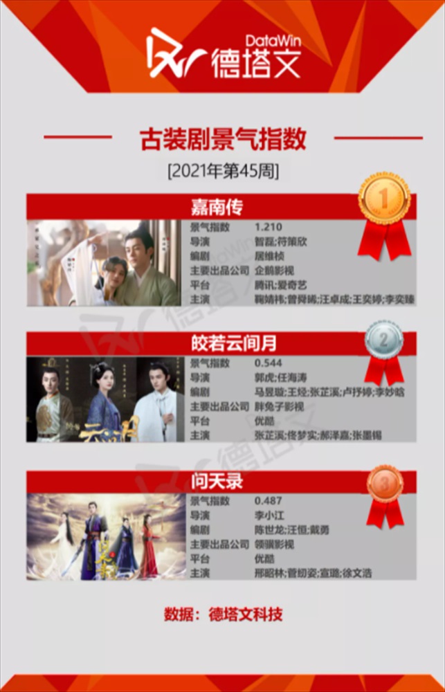 「皎若雲間月」はチャン・ジーシー(張芷溪)&トン・モンシー(佟夢実)主演のラブ史劇。シン・ジャオリンやシュアン・ルー(宣璐)らが出演する注目作のファンタジー時代劇「問天錄」は、滑り出しは今のところ落ち着いた成績に。今後の動きに期待。