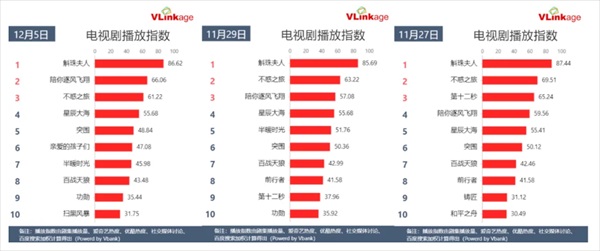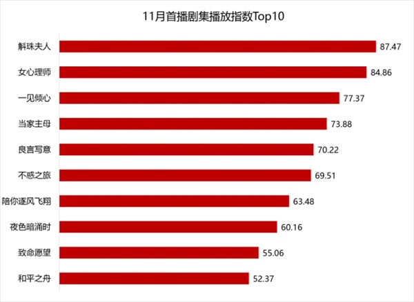 下の図では、11月の第1話の放送指数のランキングで、「斛珠<コクジュ>夫人」が1位に。大型作品が多い第4四半期(10~12月)に登場し、市場競争力が強いこのドラマは、市場からのフィードバックが最も高い作品の一つとして、現時点で最も注目されている。