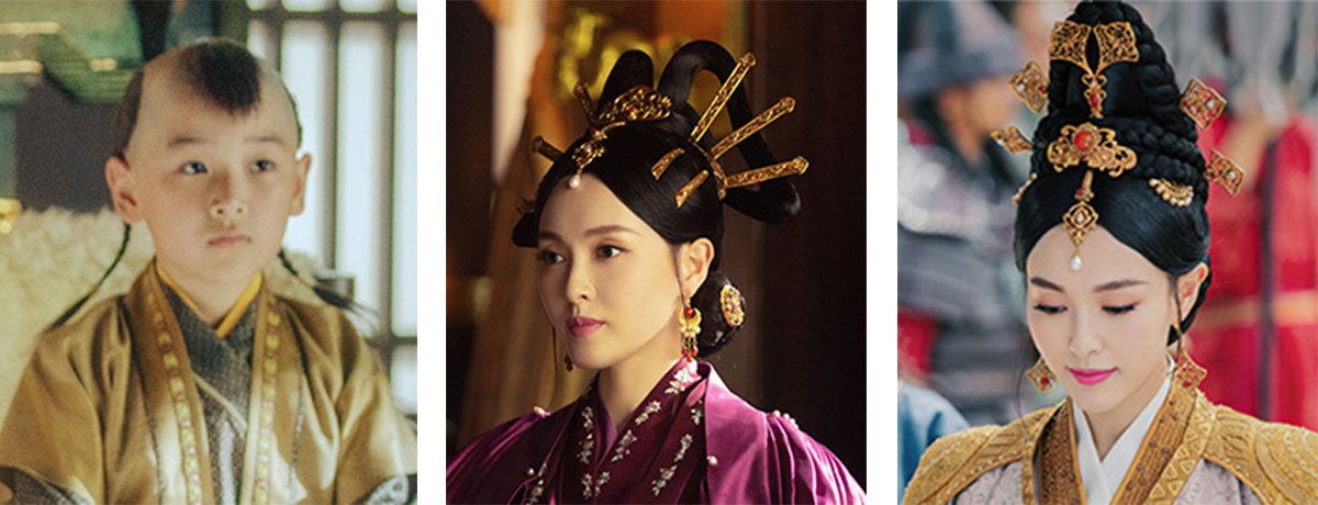 男性の伝統的なヘアスタイルは「髡髮(こんぱつ)」。頭頂部の髪を残して剃り上げ、サイドで長くした髪は編むなどして耳の横に垂らしていました。身分の高い女性は髪を高く結い上げるのが定番。蝶の羽のような髪型「蝴蝶頭」、法螺貝のように高く束ねる「螺髻」などのヘアスタイルがありました。