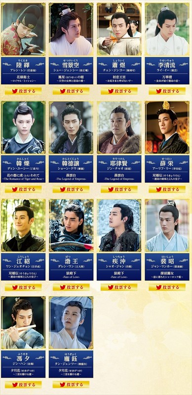 「燕雲台-The Legend of Empress-」DVD&Blu-rayリリースを記念して、「ベストキャラクターアワード2022」Twitterキャンペーンを実施。「燕雲台」含むNBCユニバーサル・エンターテイメントでリリースされた中国時代劇10作品のキャラクターたちが、「美男キャラクター部門」「美女キャラクター部門」「ベストカップル部門」の全3部門のいずれかにノミネートされているので、各部門であなたの好きなキャラクターを選び、RT(リツイート)で投票してください! ご参加頂いた方の中から総計23名様に豪華賞品をプレゼントいたします!