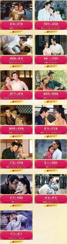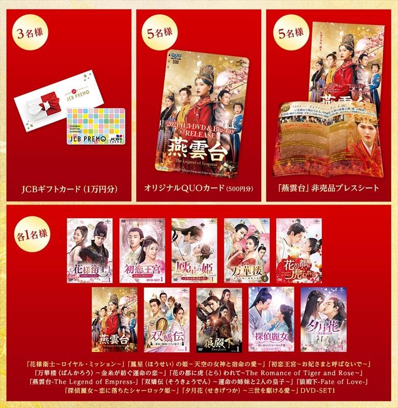 ●「花様衛士~ロイヤル・ミッション~」「鳳星(ほうせい)の姫~天空の女神と宿命の愛~」「初恋王宮~お妃さまと呼ばないで~」「万華楼〈ばんかろう〉~金糸が紡ぐ運命の恋~」「花の都に虎(とら)われて~The Romance of Tigerand Rose~」「燕雲台-The Legend of Empress-」「双嬌伝(そうきょうでん)~運命の姉妹と2人の皇子~」「狼殿下-Fate of Love-」「探偵麗女~恋に落ちたシャーロック姫~」「夕月花(せきげつか)~三世を駆ける愛~」DVD-SET1…各1名様