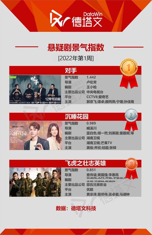 「飛虎之壮志英雄」が終わりに近づいており、経済パフォーマンスも依然として安定、視聴者を惹きつける力も非常に良好。香港作品ファンのニーズを完全に満たす魅力があり、オンラインドラマにおける“ポップコーンムービー”的な作品になっている。2位の「沈睡花園」は、ゴン・ジュン(龔俊)とチャオ・シン(喬欣)主演作で、ゴン・ジュンは心理カウンセラー役を演じる。