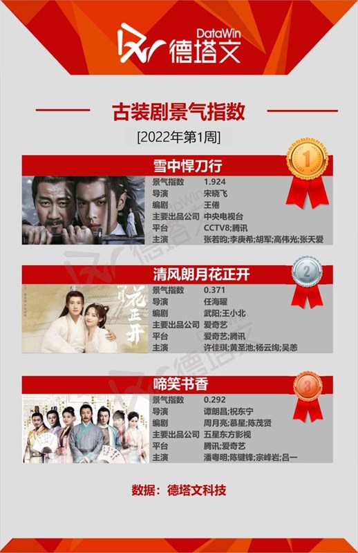 1位はチャン・ルオユン(張若昀)、リー・ゴンシー(李庚希)、フー・ジュン(胡軍)出演の「雪中悍刀行」。景気指数は、他ジャンルと上位と比較してもダントツのトップに。