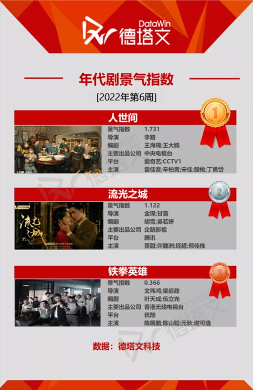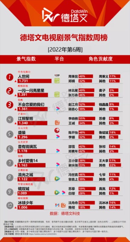 「人世間」は現在、新年の団欒風情を取り入れた最も質の高い年代劇で、世代的な視聴者が多いのと同時に、口コミでインターネットの視聴者にも浸透し続け、旧正月期間を通じて視聴成績の動きはより顕著になった。茅盾文学賞の受賞作を原作とした本作は年代劇でありつつ、家族の団結、相互寛容、愛への勇気、兄弟愛、成長などを描く。視聴者にイデオロギー的な衝突や嫌悪感を与えることもなく、近年市場で人気のある家族ドラマのモデルにも傾倒しており、ドラマと視聴者の親和性も高い。本格的な文学作品を原作としたテレビドラマの品質向上には進歩が見られ、今後も大いに期待が寄せられている。