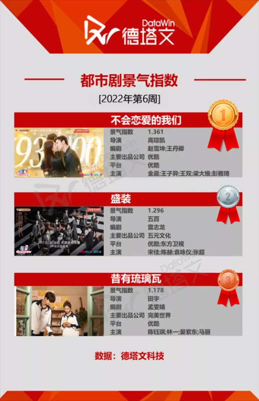 このところ、若者向けのドラマ市場ではアイドルドラマの人気が回復。市場トップ作品の「不会恋愛的我们」と、チェン・ユーチー(陳鈺琪)&リン・イー(林一)主演作「昔有琉璃瓦」のうち、「不会恋愛的我们」は本週放送開始からブームが急速に高まり、現代ドラマジャンルで見事1位を獲得した。主演を飾るジン・チェン&ワン・ズーイーの組み合わせも新鮮で、2人のケミストリー効果は非常に目を引くものと評価されている。