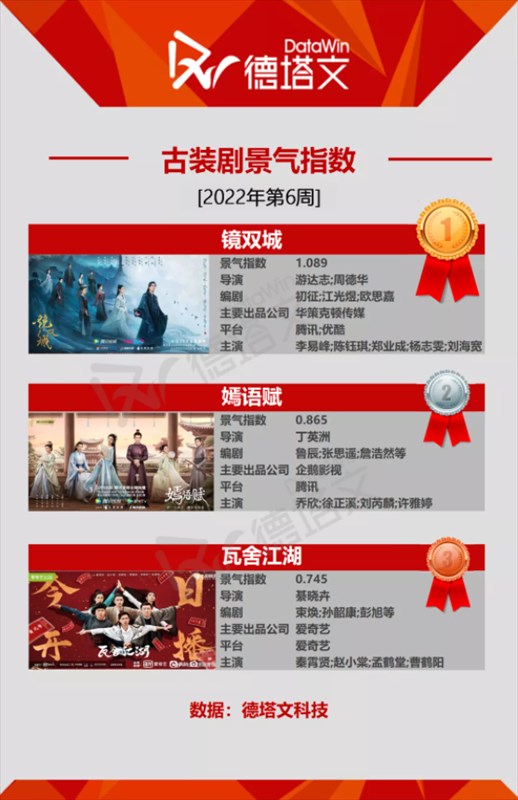 リー・イーフォン(李易峰)主演のファンタジー時代劇「鏡双城」はヒットの要素が多く、ラブラインを含めて内容も豊富で、ファンタジーの設定に基づいたトピックなどにも注目が集まった。しかし残念ながら、旧正月休暇に家でドラマを見る視聴者の多くが時代劇の消費者グループではないこともあってか、今一歩の伸びに。今後の回復に期待!