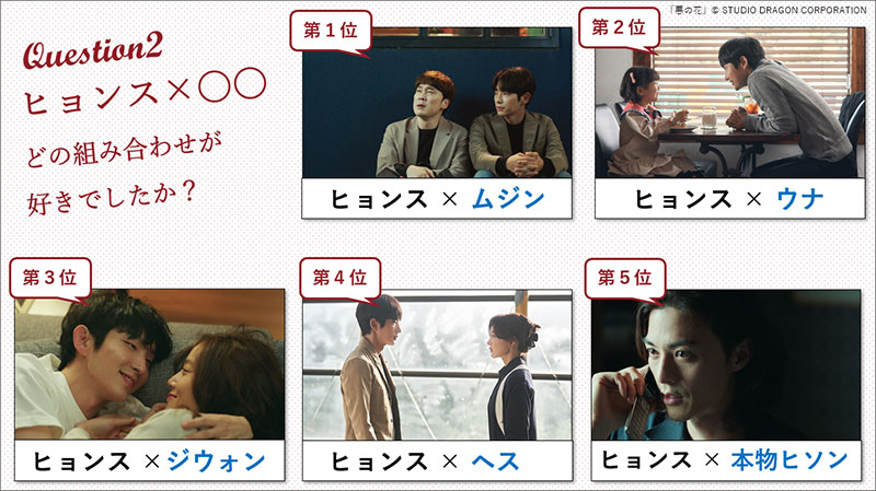 エスピーオー 矢野(以下、矢野) 第2部では「悪の花」のキャラクターの組み合わせによる演技のケミストリーについて考えていきたいと思います。皆さんに回答いただいた「ヒョンス×○○ どの組み合わせが好きでしたか?」という質問の結果はこうなりました。【ヒョンス×ムジン】が圧倒的1位、2位が【ヒョンス×ウナ】。