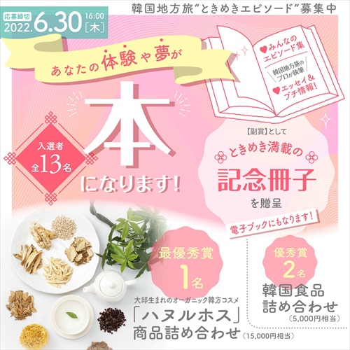 本企画は、韓国の地方旅で体験した素敵な出来事や、心ときめく夢を、その地方都市ならではの魅力と熱い想いを添えて応募いただくエピソードコンテスト。