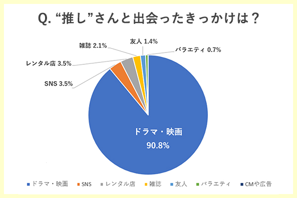 中華圏俳優を推す皆さんはどこで推しと出会うのでしょうか? アンケートのベスト3 を見てみると、1位はダントツで「出演しているドラマ・映画を見て」、今回は俳優についてのアンケートだっただけに実に9割以上の方が作品で推しと出会っていました。そして2位「SNSで見かけて」「レンタル店で見かけて」、3位「雑誌で見て」と続きます。
