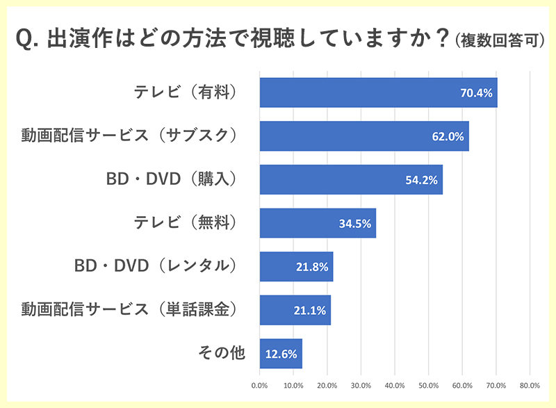 アンケートでも「テレビ(有料チャンネル)」×「動画配信サービス(サブスク)」×「Blu-ray・DVDを購入」を組み合わせて推しの出演作を見ている方が多くいらっしゃいました。この3つは中華圏俳優推しの3種の神器と言えるかもしれません。