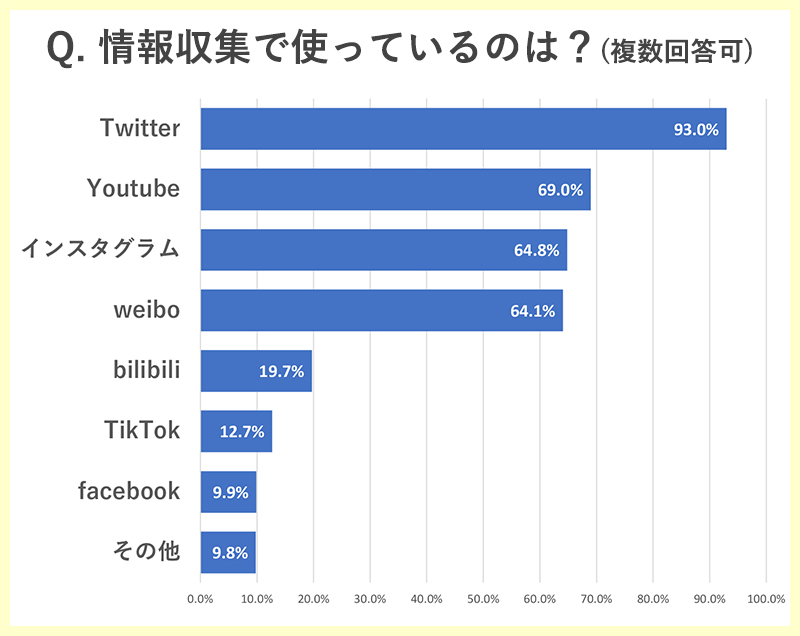 情報収集にはTwitterが広く利用されているようです。そして中国版Twitterとも呼ばれるWeiboも6割以上の方が利用。3位のインスタグラムに肉薄しました。Weiboの利用には言葉の壁があることを考えると、64.1%というのはかなり多いという印象を受けます。