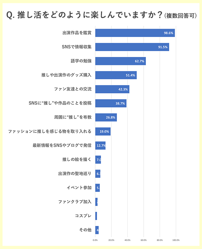 アンケートでは推し活の楽しみ方についても聞いてみました。ベスト3は「出演作を鑑賞」「SNSで情報収集」に続き、「“推し”の話す言葉がわかりたい!語学の勉強」が挙がっています。海外の俳優ならではの推し方ですね。アンケートの自由回答欄にも