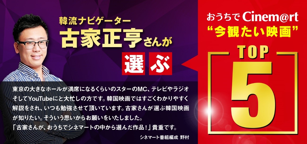韓国だけでなく、アジアコンテンツのイベントに欠かせない古家さん。どんなスター達とも抜群の相性を見せ、推しの魅力を最大限引き出してくれます。 多くのファンの信頼が深い唯一無二の存在です。古家さんのおススメ作品なら是非観たい!という方も多いはず。そしてその作品を「おうちでCinem@rt」から選んで頂きました。