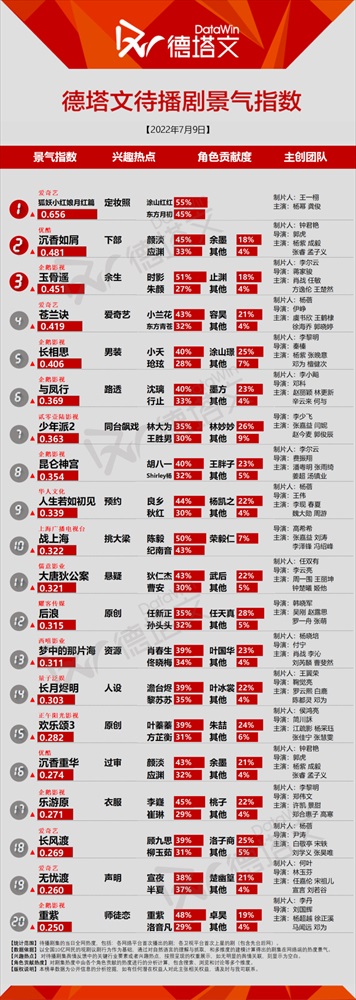 中国で市場分析を展開する德塔文科技による影視観察(datawinfilmtv)データより、2022年7月9日付けのドラマデイリー放送前作品の景気指数TOP20にランキングしたドラマを、ピックアップしてご紹介!(以下、ドラマタイトルは全て原題の表記です)