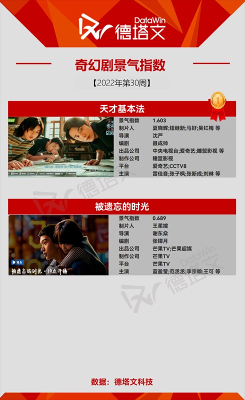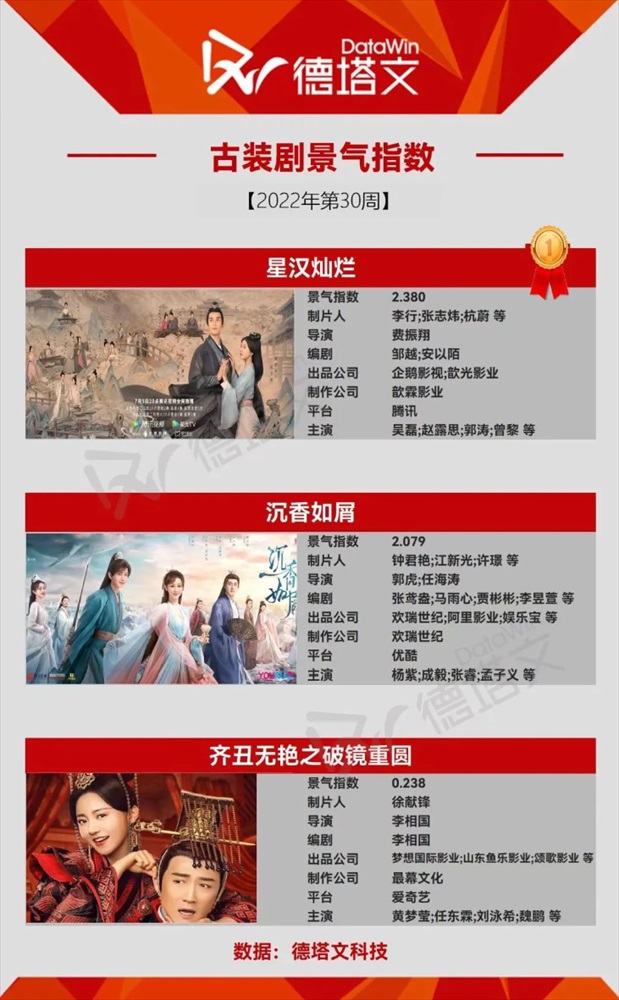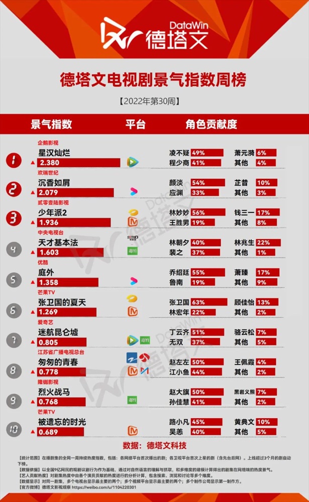 「星汉灿烂」「沈香の夢(原題:沉香如屑/沉香重華)」「少年派2」が今週のトップ3にランクイン、その後にはチャン・シンチョン (張新成)主演のファンタジードラマ「天才基本法」が続いている。上位の人気作品は、総じて「人気キャスト+コンテンツの若返り(若者向け)」の作品で、他の作品群とは大きくその差を開けることになった。