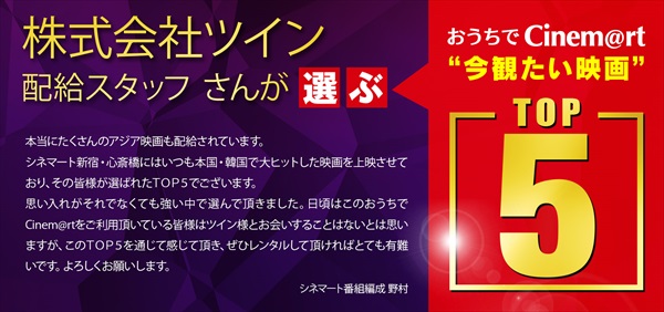 アジア映画に特化した動画配信サービス「おうちでCinem@rt -いつでも・どこでも- 」で配信中のアジア映画から、“あの人”のオススメTOP5を紹介します。今回は配給会社のツインの配給スタッフさんが選んだオススメ韓国映画TOP5! 選出理由や作品裏話はおうちでCinem@rtの公式サイトにて!