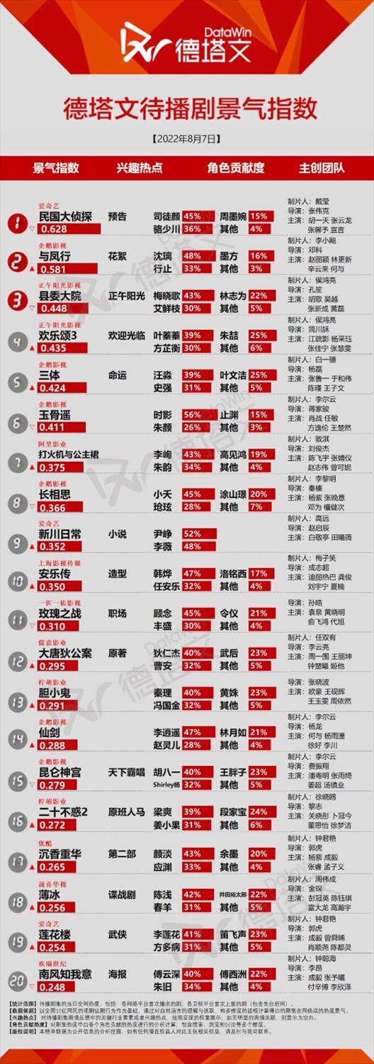 中国で市場分析を展開する德塔文科技による影視観察(datawinfilmtv)データより、2022年8月7日付けのドラマデイリー放送前作品の景気指数TOP20にランキングしたドラマを、ピックアップしてご紹介!(以下、ドラマタイトルは全て原題の表記です)