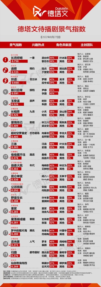 放送待機作品のランキングでは、フー・イーティエン(胡一天)と「両世歓~ふたつの魂、一途な想い~」のチェン・ユーチー(陳鈺琪)が主演を務める民国ファンタジードラマ「超時空羅曼史(原題)」が8位にランキング。現在人気の「蒼蘭訣」と同じく、恋愛ドラマを扱うiQIYI恋恋劇場(SWEET ON)での放送が予定されており、「蒼蘭訣」の人気の高さで注目度が高まる恋恋劇場での放送に、大きな期待が寄せられると同時に、景気指数も上昇を続けている。