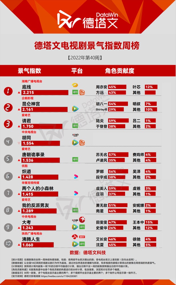 記事タイトル:「剧周报40|《底线》《昆仑神宫》头部竞争激烈,献礼剧、爱情剧占领市场大半江山」