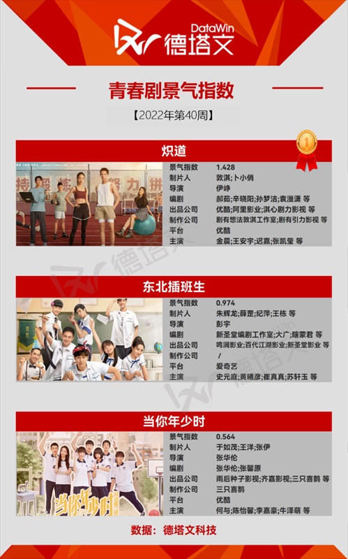 2週連続で青春ドラマの人気が過熱し、本数も好調でジャンル別トップ3を占めた。このテーマは長い間抜きんでた傑作が不足していたが、ジン・チェン(金晨)とワン・アンユー(王安宇)主演の陸上競技の世界を描いた「熾道」が、競争要素と歳の差カップルの恋愛要素をビジョンにうまく取り入れたことにより人気を獲得。