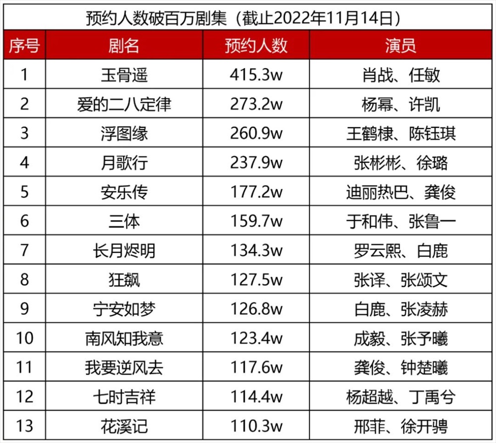 視聴予約数ランキングでは、シャオ・ジャン(肖戦)主演のファンタジー時代劇「玉骨遥」が400万以上で首位、ヤン・ミー(楊冪)&シュー・カイ(許凱)主演の現代ドラマ「愛的二八定律」、チャン・ビンビン (張彬彬)&シュー・ルー(徐璐)の時代劇「月歌行」、ワン・ホーディー(王鶴棣)&チェン・ユーチー(陳鈺琪)の時代劇「浮図縁」の3作品が200万を突破、ディリラバ(迪麗熱巴)&ゴン・ジュン(龔俊)主演「安楽傳」、 SFドラマ「三体」、レオ・ロー(羅雲熙)× バイ・ルー(白鹿)主演「長月燼明」、刑事ドラマ「狂飆」、チョン・イー(成毅)&チャン・ユーシー(張予曦)主演「南風知我意」、ゴン・ジュン&チョン・チューシー(鐘楚晞)主演の現代ドラマ「我要逆風去」、シュー・カイチョン(徐开骋)&シン・フェイ(邢菲)主演「花溪記」、バイ・ルー&ジャン・リンホー(張凌赫)主演「寧安如夢」、ヤン・チャオユエ(楊超越)&ディン・ユーシー(丁禹兮)主演の「七時吉祥~エンドレス・ラブ~」などのドラマはすべて100万を超えている。