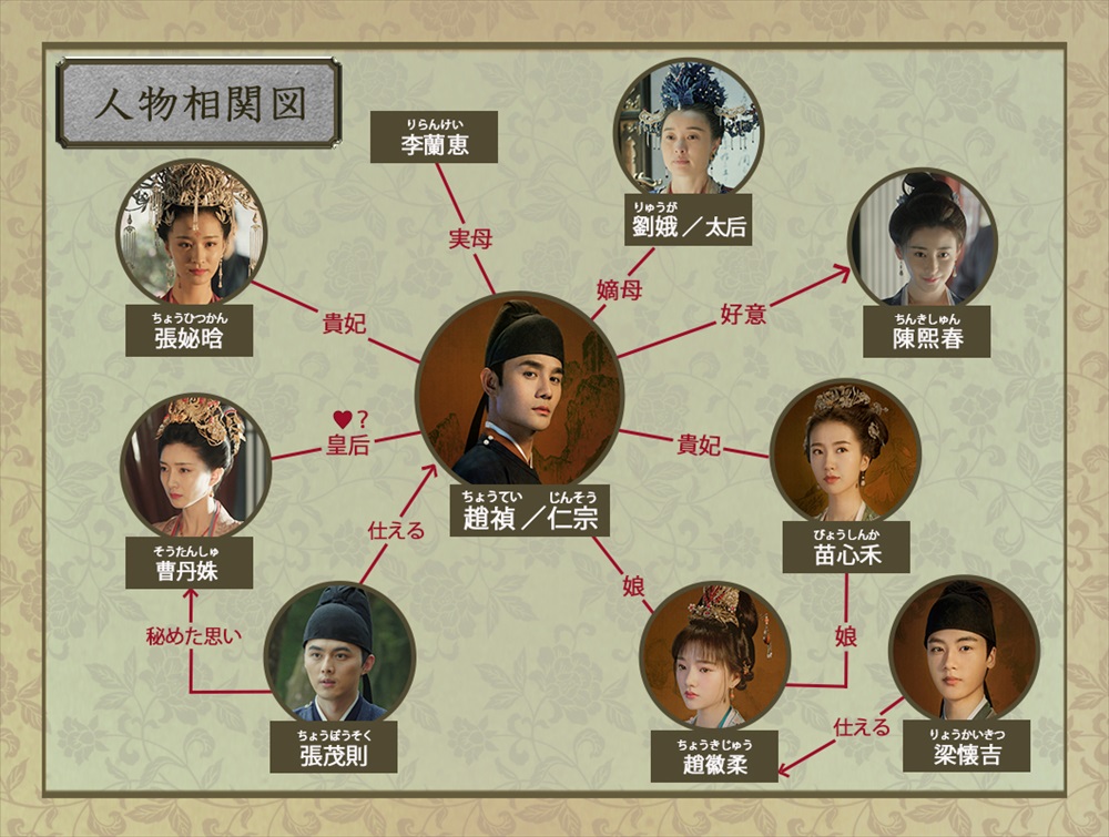 朝廷での権力争いや国政が史実に基づき描かれる一方で、情緒豊かに映し出されているのが後宮で暮らす側室や娘の姿。趙禎の乳母の娘として幼い頃から趙禎を兄と慕う、長子の趙徽柔を産んだ側室の苗心禾。大胆な性格と美貌で趙禎に見染められ、寵愛を一心に受ける宮中の踊り子出身の側室・張妼晗。そして趙禎が溺愛する娘の趙徽柔の、3人の女性たちの切ない心の機微が丁寧に描かれていく。