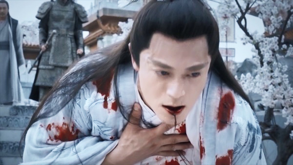 「山河令」より。温客行が死んだと聞き、吐血する周子舒。吐血直前の表情も注目です