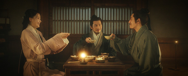 仲良く酒を酌み交わす翟悦(左)と荀詡(中央)、陳恭(右)