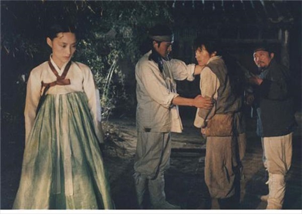 それがきっかけで、彼女は評判の芸妓ミョンウォルになるのですが、渓谷で歌うシーン以外には、華麗な舞を見せたり、琴の腕前を披露したりといった、名妓としての本領を発揮する場面は出てきません。しかも、恋に落ちた相手と心ならずも別れた後は、場末の宿屋で酌婦を務め、そこで出会った訳ありの学者と放浪の旅に出て、さらに苦境へと身を落としていくのです。