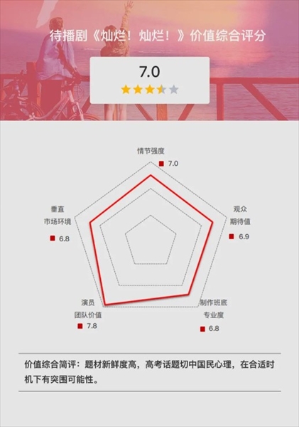 全体の作品評価の数値は、実力派キャストから注目の若手キャストが揃ったというキャストの豪華さもあり、俳優陣への評価とテーマ性の評価が他の項目と比べて高めとなった。テーマ性も非常に新鮮味があり、特に国民的関心度が高い“高考”に切り込む作品ということで、ヒットの予感も強いと予測されているようだ。若者たちの学生生活、成長なども描かれており、青春ドラマとしての展開もあることから、学生視聴者への浸透にも期待が寄せられている。