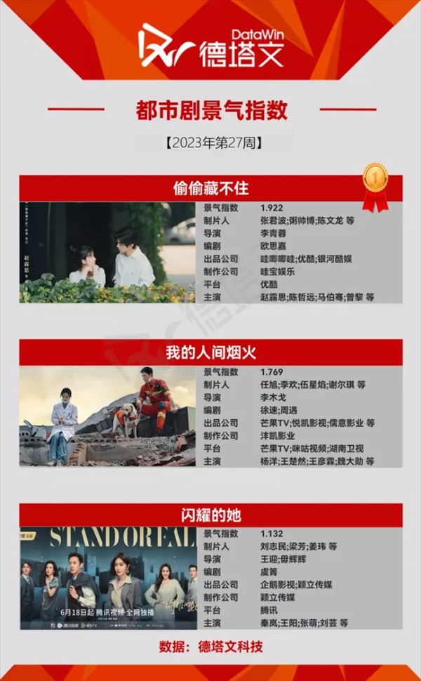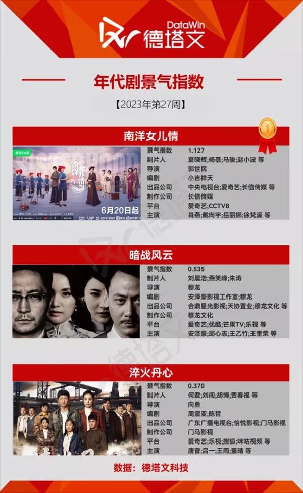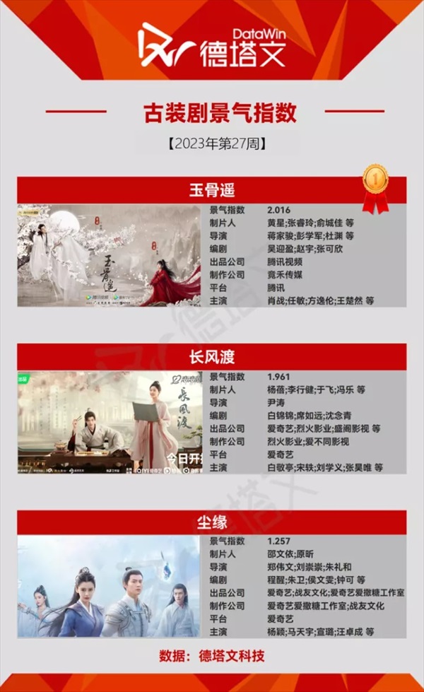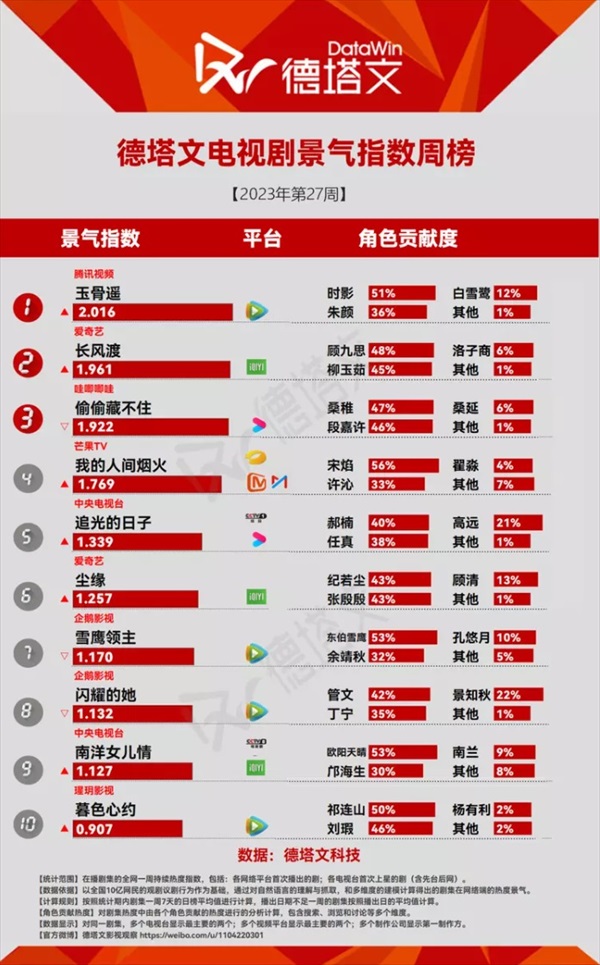 中国で市場分析を展開する德塔文科技による影視観察(datawinfilmtv)データより、2023年第27週(07.03-07.09)のドラマ景気指数TOP10にランクインしたドラマを、ピックアップ!(以下ドラマ表記名は全て原題)