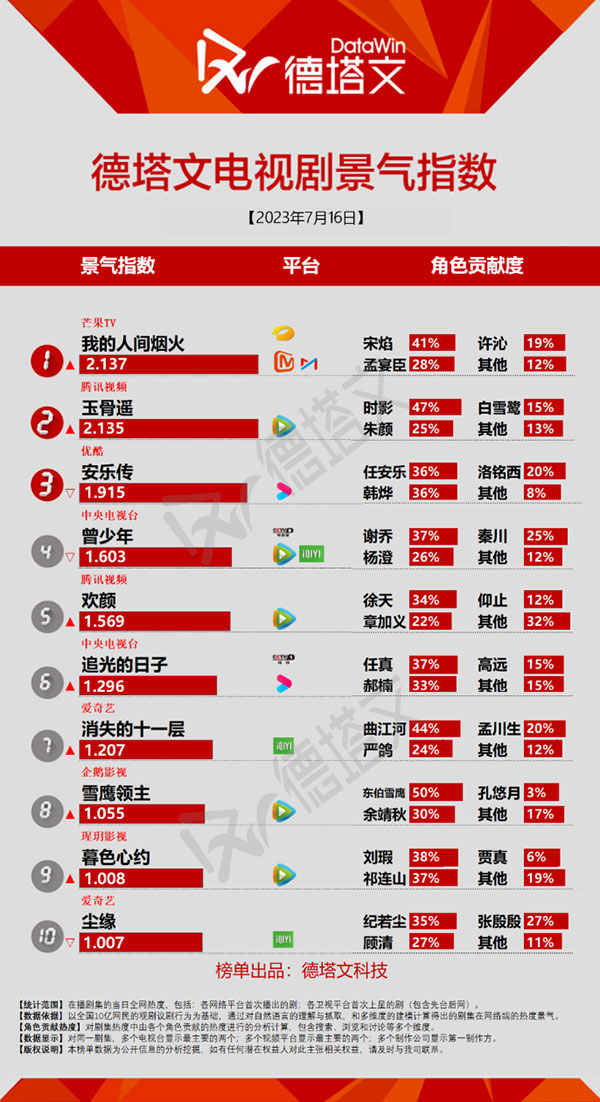 この日取り上げられた注目作品は、7月12日からyoukuで“空降”放送が開始となった時代劇「安楽伝」。この日の景気指数は 1.915 で、ランキングリストの 3 位になった。ゲリラ的な“空降”放送が初回放送の普及に影響を与えただけでなく、ディリラバ(迪麗熱巴)+ゴン・ジュン(龔俊)という強力な魅力の組み合わせで、依然として高い注目を集めており、すでに好成績を獲得している。