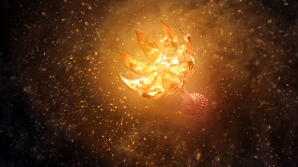 地止は、応淵帝君の神器。上部は自由に開くことができる8枚の花びらで構成され、中央部はくり抜かれたねじれた枝のパターンで包まれ、輝く後光がわずかに現れます。