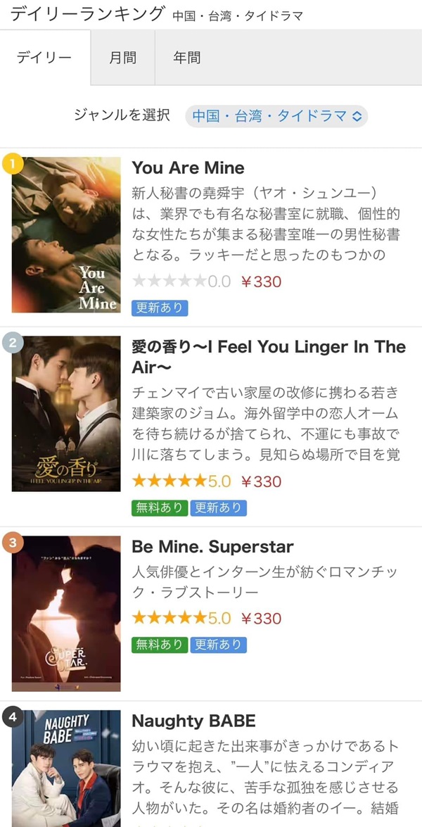 Rakuten TV デイリーランキング(中国・台湾・タイドラマ部門)