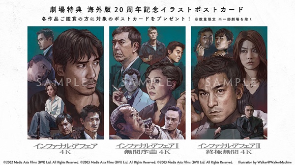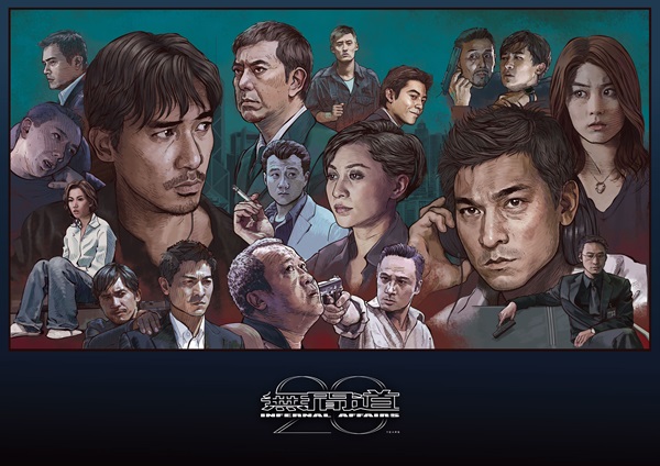 この度、シリーズ全3部作に登場する個性豊かなキャラクターたちが描かれた、海外版20周年記念イラストビジュアルが解禁!昨年の香港公開20周年を記念して制作されたイラストをもとに構築した特別なビジュアルとなり、左から1作目『インファナル・アフェア』、2作目『インファナル・アフェアII 無間序曲』、3作目『インファナル・アフェアIII 終極無間』それぞれを象徴する登場人物たちが配置されている。