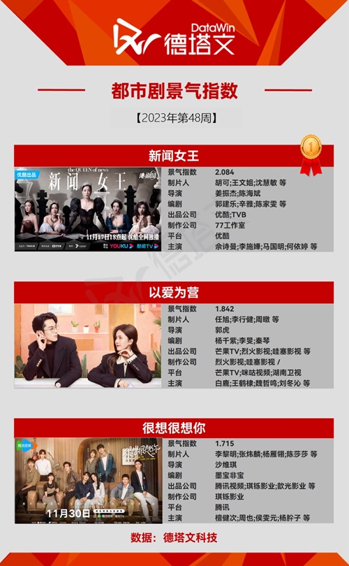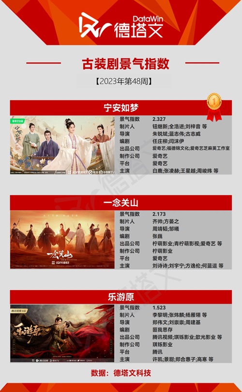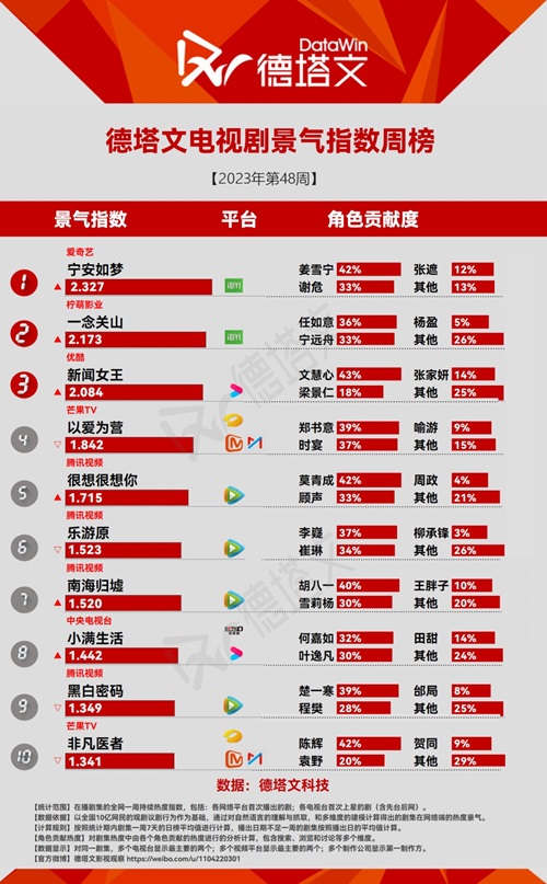中国で市場分析を展開する德塔文科技による影視観察(datawinfilmtv)データより、2023年第48週(11/27-12/3)のドラマ景気指数TOP10にランクインしたドラマを、ピックアップ!(以下ドラマ表記名は全て原題)
