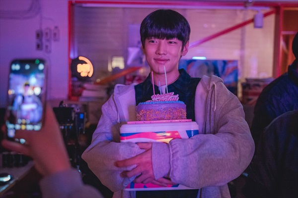 撮影中からその仲の良さは評判だったようで、この度貴重なオフショットが到着!二人が笑顔で向き合って談笑するカットは、およそ16cmと言われるカップル理想の身長差(※諸説あります)が際立ち、ファンの黄色い悲鳴が聞こえてきそうだ。また、演技のチェックをしているのか、二人でカメラをのぞき込む様子や、夜間の撮影中ソハムがジェチャンを気遣うように見つめるカットも。その他、劇中に登場し大きなインパクトを与えた「全身真っ赤なコーデ」でコーラの缶を持ちポーズをとるお茶目なソハムや、撮影期間に誕生日を迎えたジェチャンが、キュートな萌え袖で大きなケーキを抱えるカットなどなど、ファン垂涎の一挙8枚大公開となった!撮影の裏側からもあふれ出るその幸せな雰囲気は、作中からも存分に発揮されており、ぜひ劇場に“ハッピーなキュン”を浴びにきてほしい。