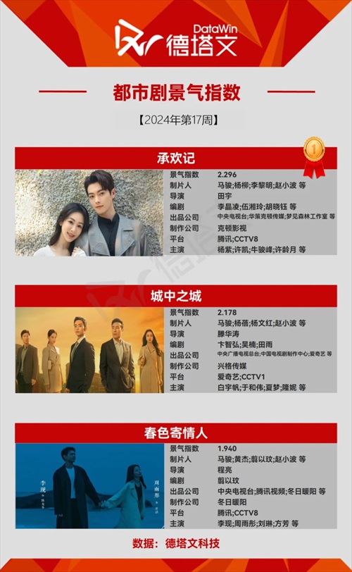 中国で市場分析を展開する德塔文科技による影視観察(datawinfilmtv)データより、2024年第17週(4/22-28)のドラマ景気指数TOP10にランクインしたドラマを、ピックアップ! (以下ドラマ表記名は全て原題)